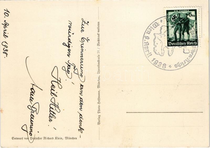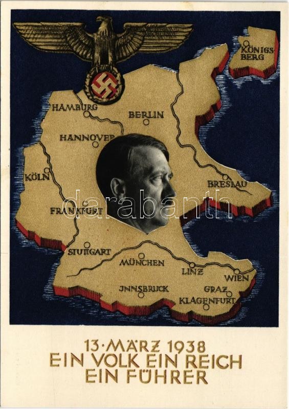 1938 März 13. Ein Volk, ein Reich, ein Führer! / Adolf Hitler, NSDAP German Nazi Party propaganda, map, swastika. 6 Ga. s: Professor Richard Klein + "Tag des Großdeutschen-Reichs Wien 9. April 1938" So. Stpl.