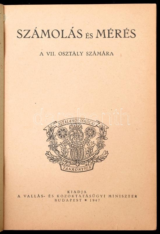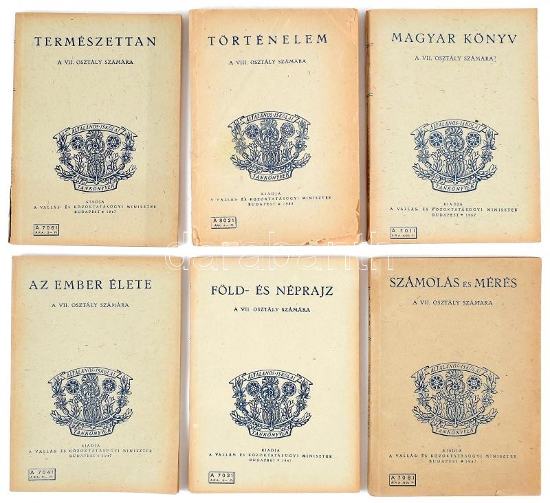 6 db általános iskolai tankönyv (VII-VIII. osztály): Az ember élete; Magyar könyv; Föld- és néprajz; Természettan; Számolás és mérés. A VII. osztály számára. + Történelem. A VIII. osztály számára. Bp., 1947-1948, Vallás- és Közoktatásúgyi Miniszter. Kiadói papírkötés, néhány sérült borítóval.
