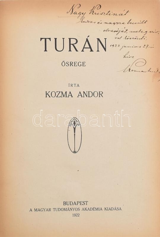 Kozma Andor: Turán. Ősrege. A szerző által DEDIKÁLT! Bp., 1922, MTA. 2... https://www.darabanth.com/hu/425-Gyorsarveres/425.0/Konyvek/Konyvek-Egyeb-ritkasagok~1000023/Kozma-Andor-Turan-Osrege-A-szerzo-altal-DEDIKALT-Bp-1922-MTA-247-p-Elso-kiadas-Kes~II2709130