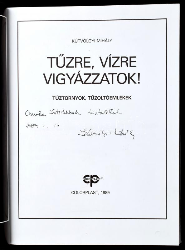 Kútvölgyi Mihály: Tűzre, vízre vigyázzatok! Tűztornyok, tűzoltóemlékek. Bp., 1989, Colorplast. Rendkívül gazdag képanyaggal illusztrált. Kiadói kartonált papírkötés, a borítón kis sérülésekkel. A szerző által Csurka István (1934-2012) József Attila-díjas író, dramaturg, politikus részére DEDIKÁLT példány.