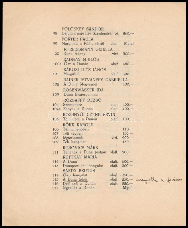 A Nemzeti Szalon művészeti egyesület első representativ Duna-kiállításának katalogusa, 1933 január hó. H.n., 1933, k.n. Sárdy Brutus (1892-1970), a kiállítás egyik részvevőjének autográf feliratával a műtárgyjegyzékben szereplő festménye mellett ("Megvette a főváros"). Kiadói papírkötés, hajtásnyommal.