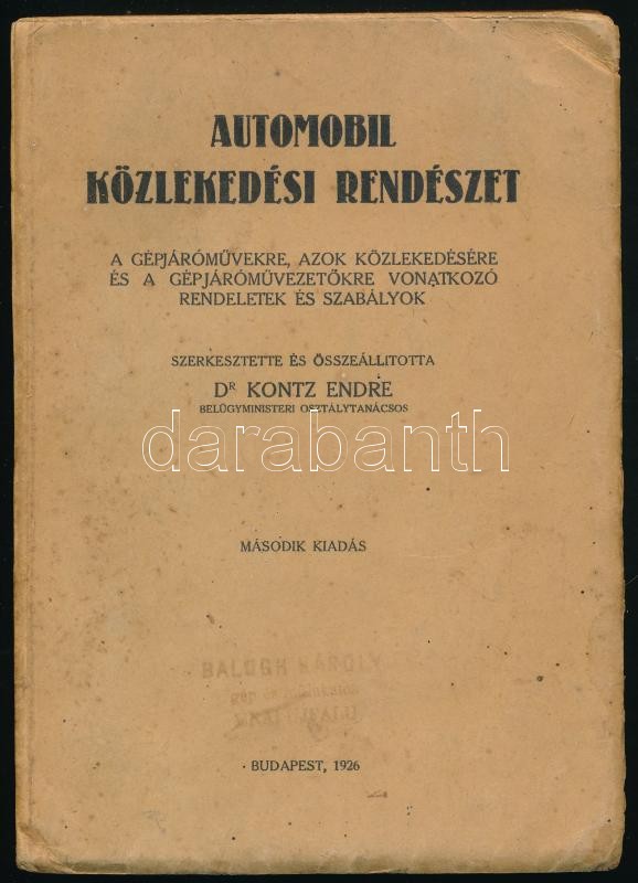 Automobil közlekedési rendészet. A gépjárművekre, az közlekedésére és a gépjárművezetőkre vonatkozó rendeletek és szabályok. Szerk. és összeáll.: Kontz Endre. Bp., 1926.,(Pallas-ny.) Második kiadás. Kiadói papírkötés, kissé foltos borítóval.