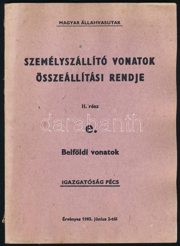 Személyszállító vonatok összeállítási rendje. II. rész. E köt. Belföldi vonatok. Magyar Államvasutak Igazgatóság Pécs. Bp., 1985, Kossuth-ny., 105 p. Kiadói papírkötés, kissé sérült borítóval, kissé hullámos, helyenként kissé foltos lapokkal.