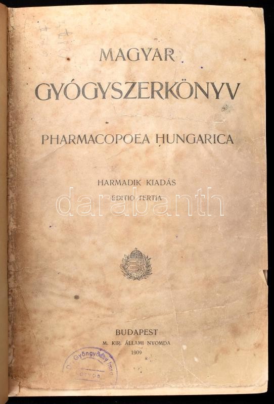 Magyar Gyógyszerkönyv. Pharmacopoea Hungarica. [Magyar és latin kötet egybekötve.] III. kiadás. Edito Tertia. Bp., 1909, M. Kir. Állami Nyomda, XX+414; 4+XIII+424 p. Magyar és latin nyelven. Átkötött kopott félvászon-kötés, rossz állapotban, kopott, sérült borítóval, javított gerinccel és kötéssel, ceruzás jegyzetekkel.