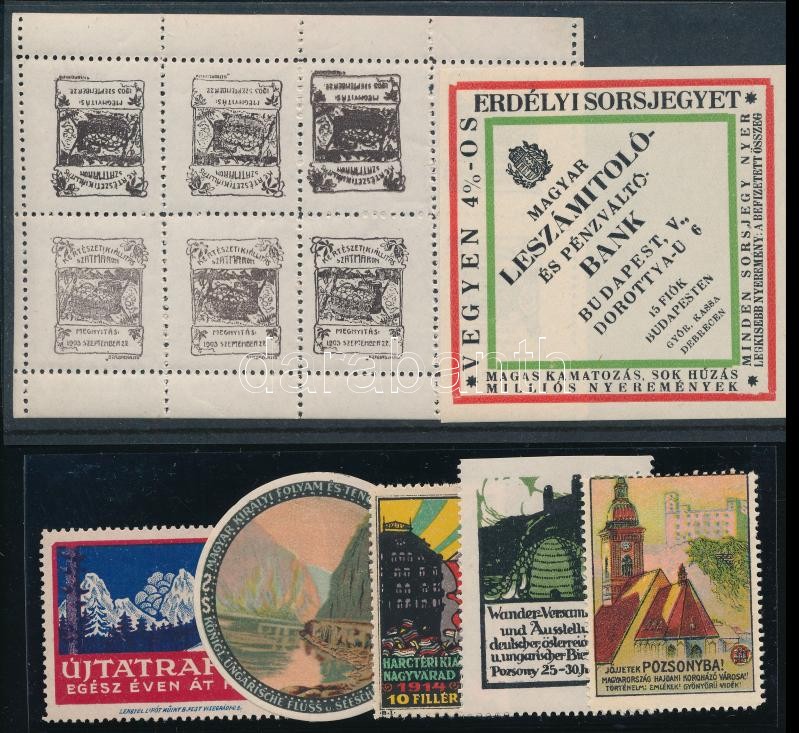 Leírás: 14 db levélzáró főleg elcsatolt erdélyi és felvidéki városokból, benne egy kisív "Kertészeti Kiállítás Szatmáron"