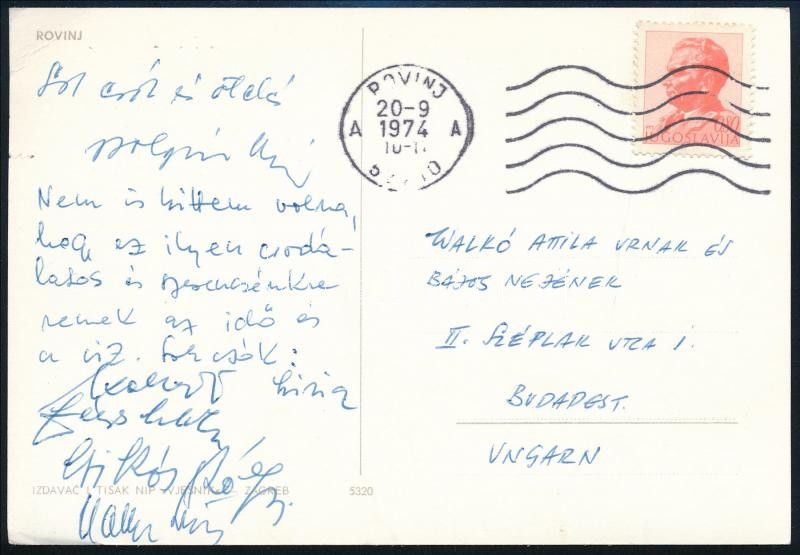 1974 Rovinj, Csikós Rózsi (1913-1992) színésznő, Fényes Szabolcs (1912-1986) zeneszerző és Bolgár László (1911-1990) újságíró, műfordító autográf aláírása Horvátországból hazaküldött képeslapon