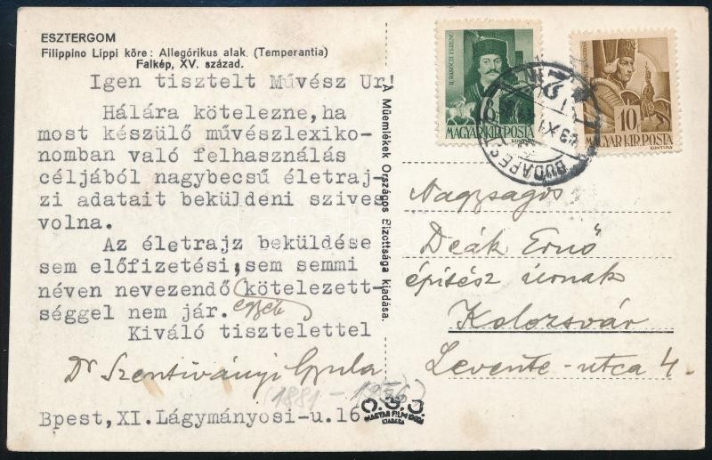 Leírás: Dr. Szentiványi Gyula (1881-1956) művészettörténész, az Éber-féle Művészeti Lexikon egyik szerkesztőjének aláírt lapja Deák kolozsvári építész részére