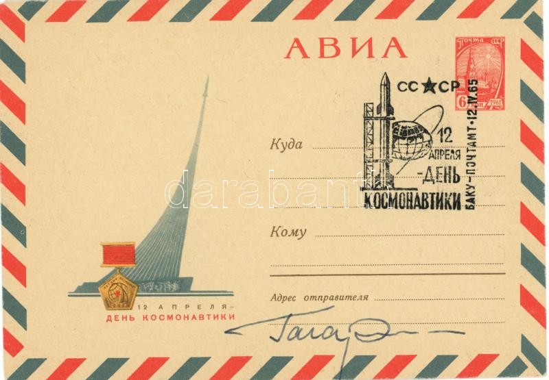Jurij Alekszejevics Gagarin (1934-1968) szovjet űrhajós autográf aláírása alkalmi borítékon / Autograph signature of Yuriy Alekseyevich Gagarin (1934-1968) Soviet astronaut on special cover