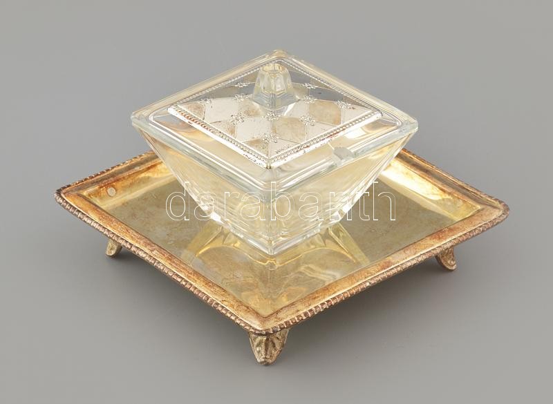 Leírás: Mustáros kínáló. Ezüstözött fém tálca, üveg edény, ezüstözött fém fedővel, fedő repedéssel 11x11 cm, 17x17 cm