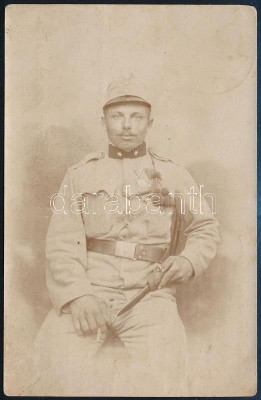 1915 Magyar katona kitüntetésekkel, lövészbojttal, zsinórral, bajonett... https://www.darabanth.com/hu/425-Gyorsarveres/425.0/Mutargy-papirregiseg-egyeb/Militaria~500030/1915-Magyar-katona-kituntetesekkel-loveszbojttal-zsinorral-bajonettel-fotolap-sajat-kezC5~II2713248
