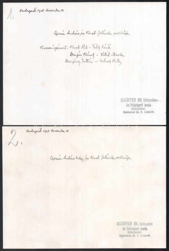 1938 Bp., Csiszár András hadnagy és Knob Jolán esküvője, Schäffer Gyula felvételei, 2 db pecséttel jelzett, feliratozott fotó (az egyiken a képen szereplők nevesítve), 23x17 cm