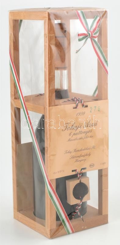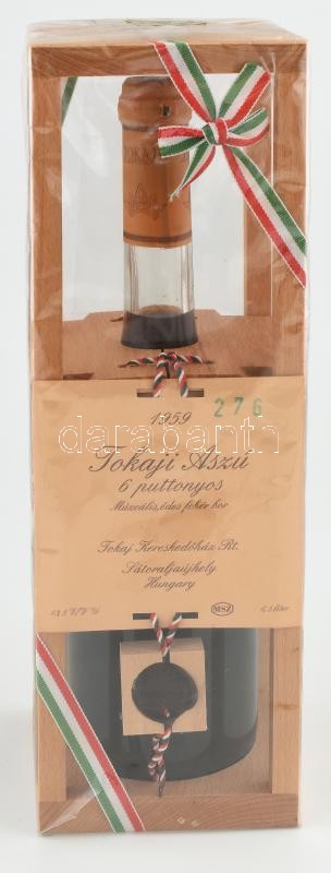 Leírás: 1959 6 puttonyos tokaji aszú bontatlan palack muzeális bor díszcsomagolásban, sorszámozott. 0,5l