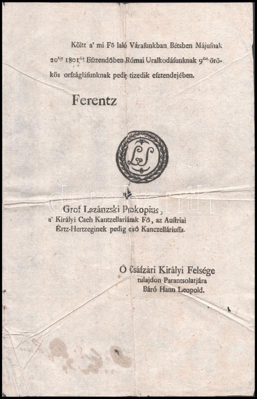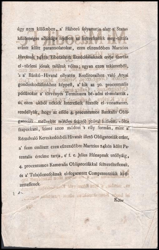 Leírás: 1801 II. Ferenc rendelete a napoleoni háborúk miatt felvett államkölcsön kifizetésének átütemezéséről 4 p.hajtva