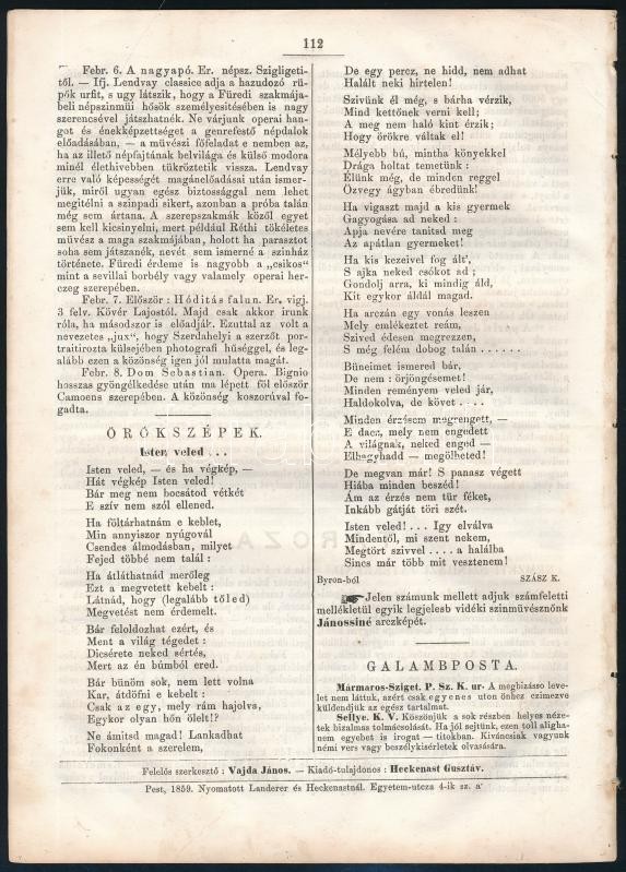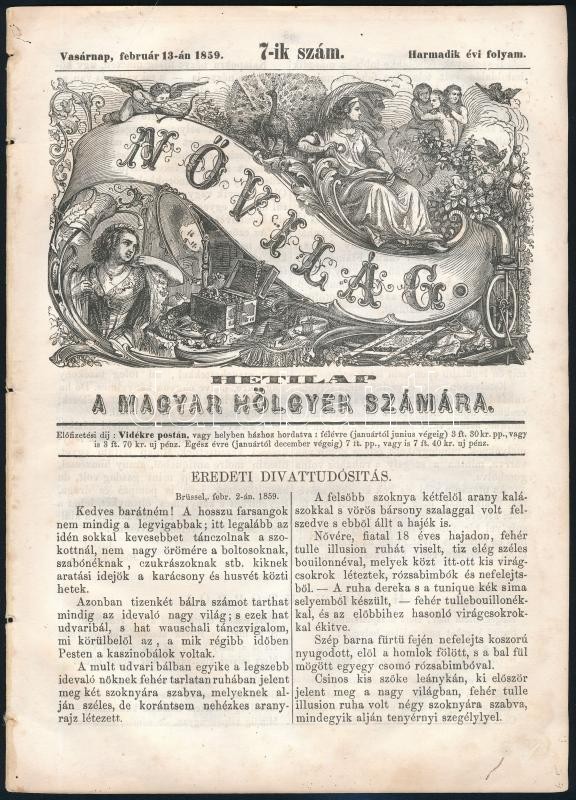 1859 A Nővilág c. hetilap 1859. febr. 13-i száma, Pest, Landerer és He... https://www.darabanth.com/hu/425-Gyorsarveres/425.0/Mutargy-papirregiseg-egyeb/Nyomtatvanyok~1000002/1859-A-Novilag-c-hetilap-1859-febr-13-i-szama-Pest-Landerer-es-Heckenast-ny-97-112-p-nC3~II2707675