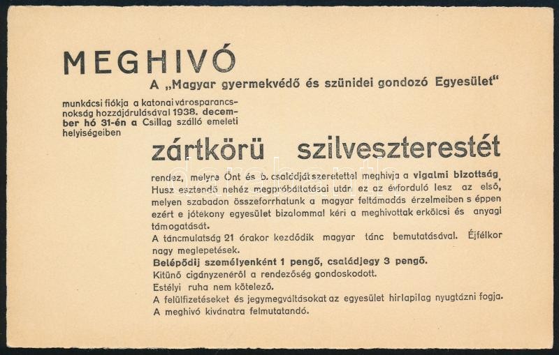 Leírás: 1938 A Magyar Gyermekvédő Egyesület meghívója Munkács város szilveszterestjére, a meghívó szövegében utalás a magyar feltámadás irredenta jellegére