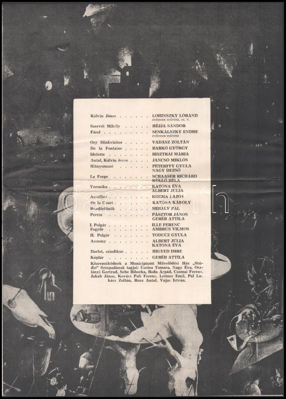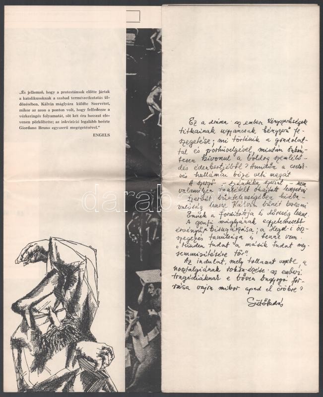 Leírás: 1974 Sütő András: Szervét Mihály c. darabja bemutatójának programfüzete hajtva