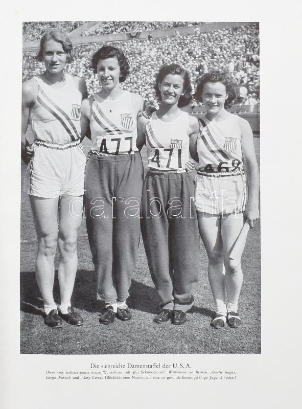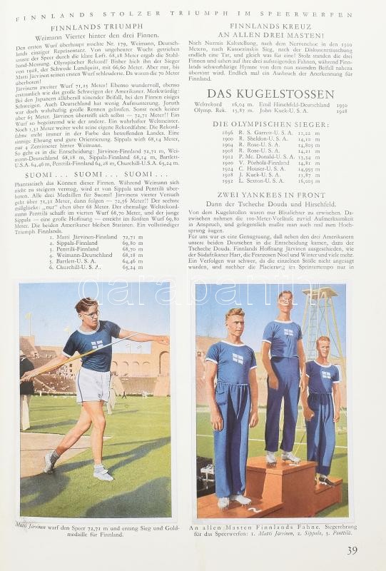 Die Olimpischen Spiele in Los Angeles 1932. Diese Chronik der X. Olympischen Spiele z Los Angeles Im Jahre 1932. Hamburg-Bahrenfeld, 1932., H. F. & P. H. F. Reemtsma. Kiadói kissé foltos aranyozott egészvászon-kötés, kiadói javított, kissé szakadt papír védőborítóban. Cigaretta gyűjtőkép album, jó állapotú, de nem teljes!/
