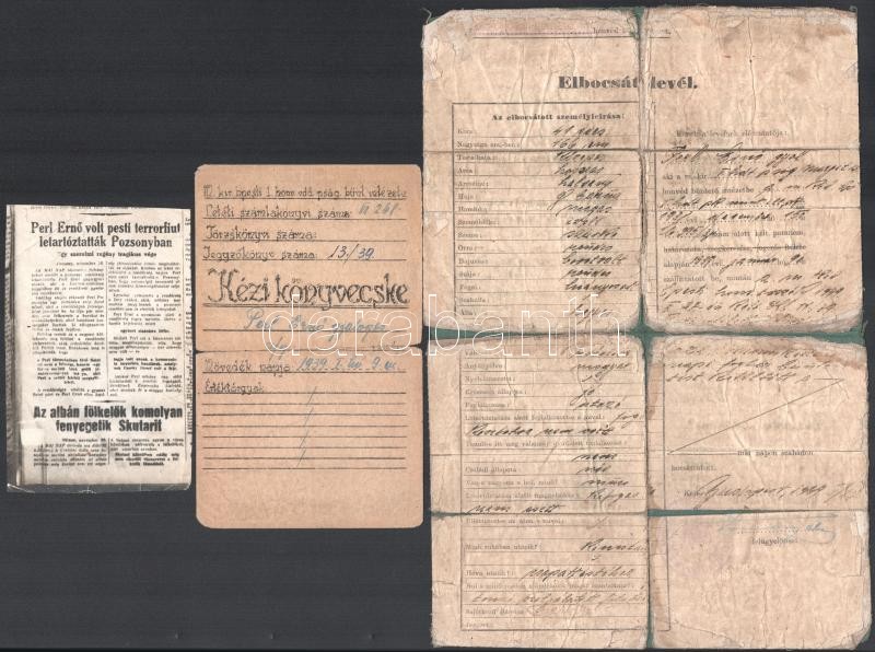 1937-1939 Elbocsátó levél a Budapesti Margit körúti Büntető Intézetből és jegyzőkönyv a vezető foglár aláírásával, mellékelve egy újságcikk amelyből kiderül, hogy Perl Ernő lányszöktetés miatt mikor szabadult és újra elfogták mint egy kommunista, terrorista banda tagját