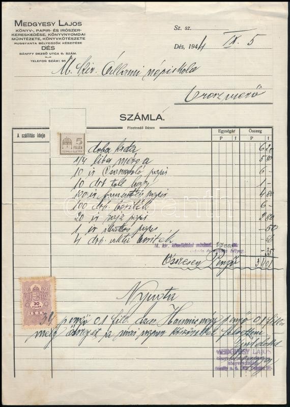 1944 Dés (Dej, Észak-Erdély), Medgyesy Lajos könyv-, papír- és írószer-kereskedő fejléces számlája, az oroszmezői m. kir. állami népiskola részére kiállítva, 30+5f illetékbélyeggel