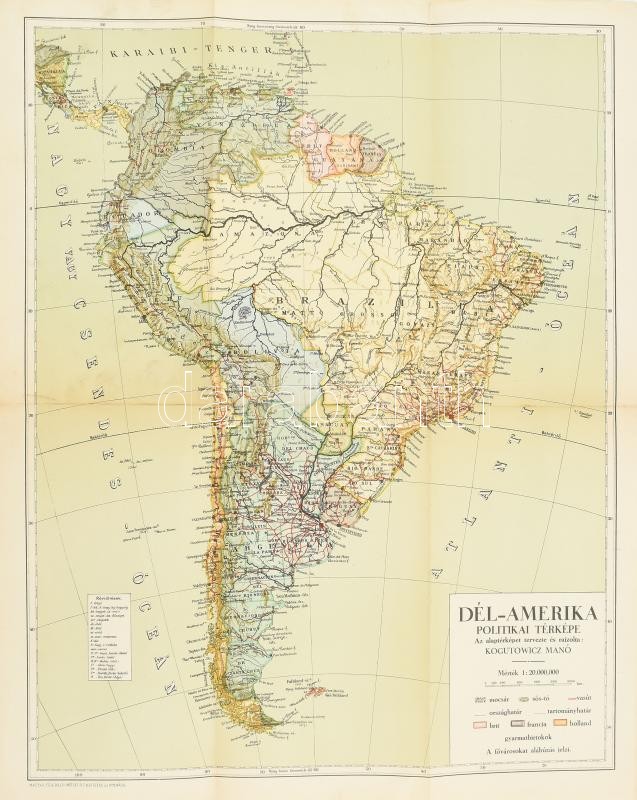 Leírás: Dél-Amerika politikai térképe, tervezte: Kogutowicz Manó, 1:20 000 000, Magyar Földrajzi Intézet Rt., 92×66 cm