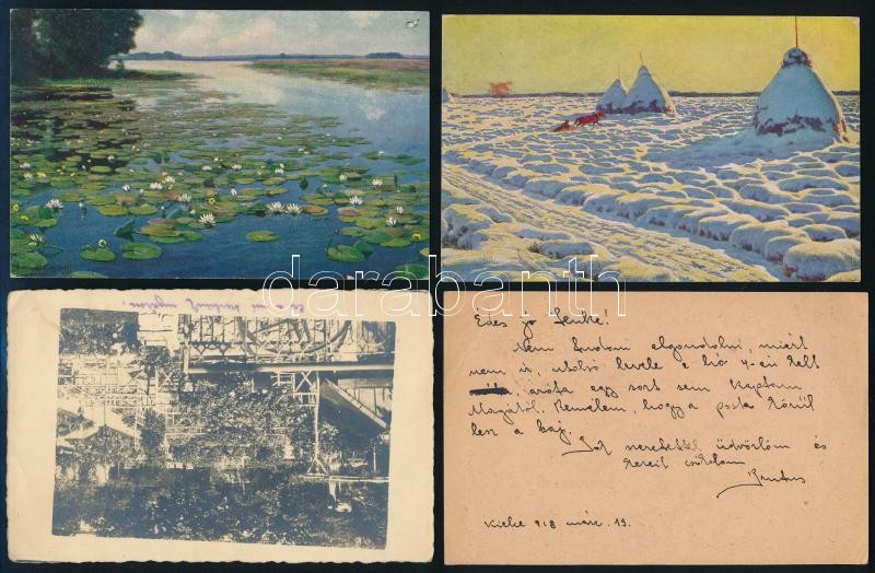 Leírás: 1918 Sárdy Brutus (1892-1970) festőművész, restaurátor 4 db I. világháborús tábori postai képeslapja későbbi feleségéhez, Kézdi-Kovács Lenkéhez, Kézdi-Kovács László (1864-1942) festőművész, műkritikus lányához. Mindegyiken K.u.k. Trainretablierungsstation des A.O.K. in Kielce bélyegzővel, Sárdy Brutus autográf aláírásával.