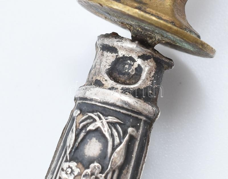 Leírás: Ezüst (Ag) nyelű 4 darabos desszert szervírozó, jelzett, kopott, h: 16 cm, cca. nettó: 40 g