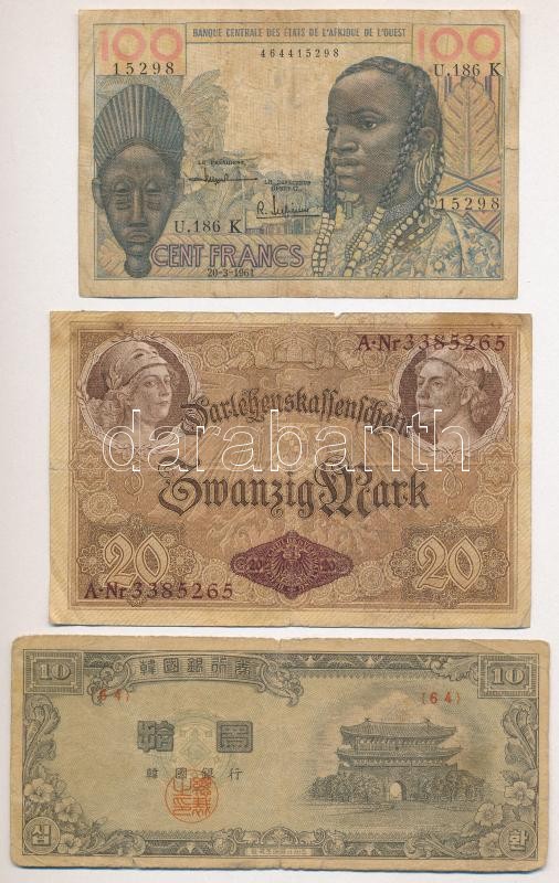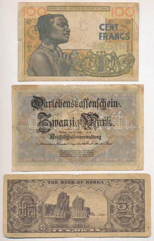 3db-os vegyes külföldi bankjegy tétel, közte Dél-Korea 1953. 10H + Német Birodalom 1914. 20M, 7 számjegyű sorszámmal + Nyugat Afrikai Államok / Szenegál 1961. 100Fr T:III,III- szakadás, folt
