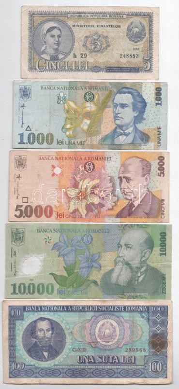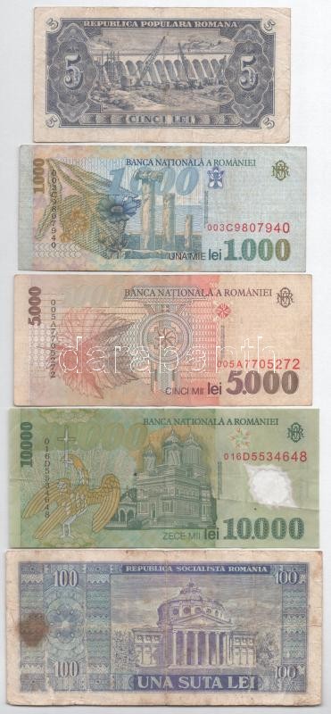 Leírás: Románia 1952. 5L + 1966. 100L + 1998. 1000L + 5000L + 2000. 10.000L T:III folt