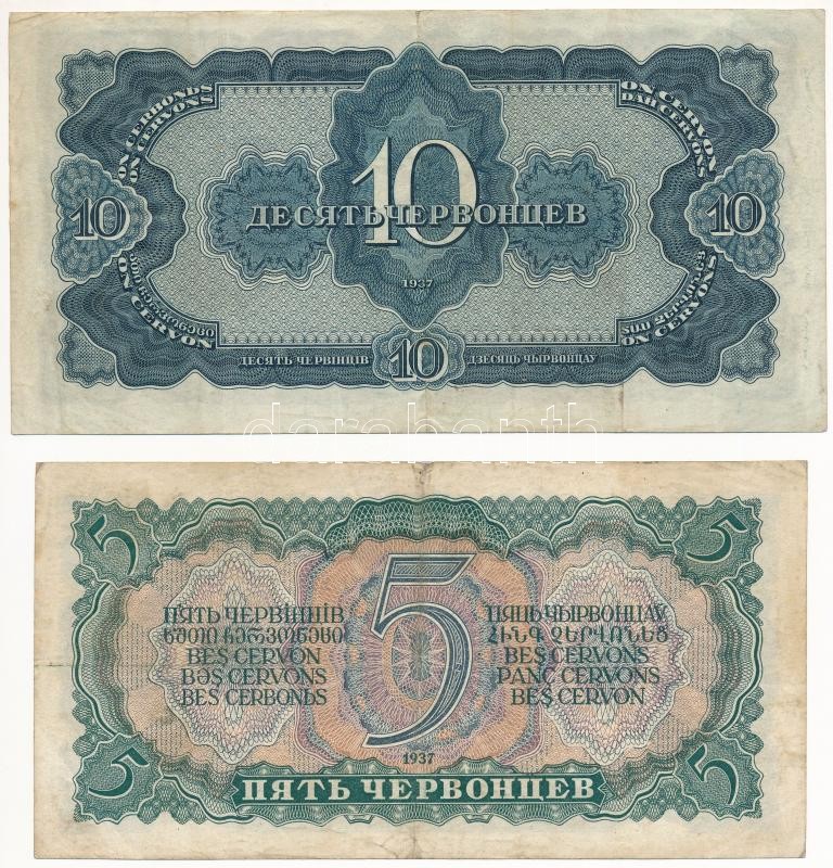 Soviet Union 1937. 5 Chervontsev +... https://www.darabanth.com/hu/425-Gyorsarveres/425.0/Numizmatika/Kulfoldi-bankjegyek~1500014/Szovjetunio-1937-5Ch-plus-10Ch-TIII-Soviet-Union-1937-5-Chervontsev-plus-10-Chervontsev-CF-Krause-P~II2711063