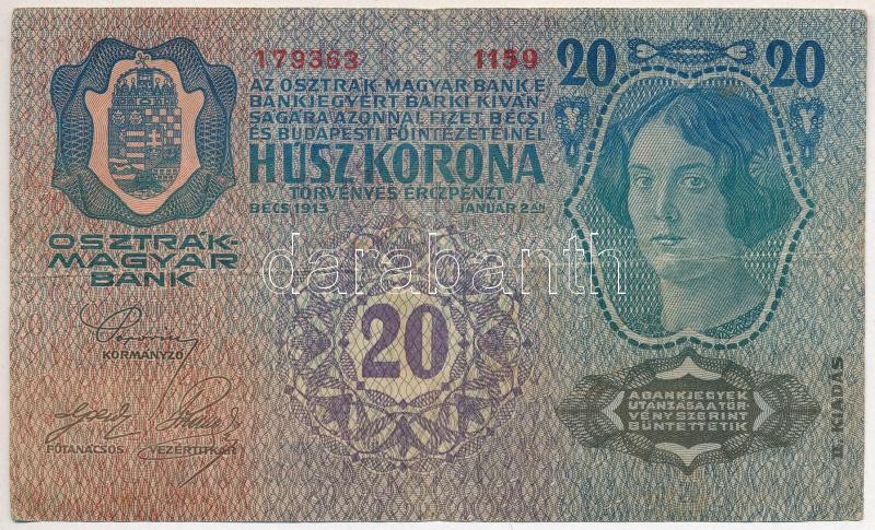 Leírás: 1913. 20K II. kiadás "1159 179363", piros "DEUTSCHÖSTERREICH" felülbélyegzéssel T:III kis folt