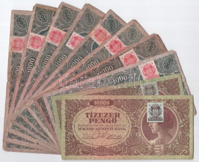 Leírás: 1945. 1000P (8x) + 10.000P (2x) mind "MNB"-s bélyeggel