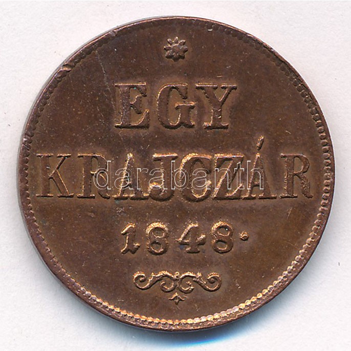 1848. 1kr Cu T:2 ph. Adamo B1 https://www.darabanth.com/hu/425-Gyorsarveres/425.0/Numizmatika/Magyar-es-magyar-verdejelu-fem-es-ezustpenzek~1500008/1848-1kr-Cu-T2-ph-Adamo-B1~II2700488