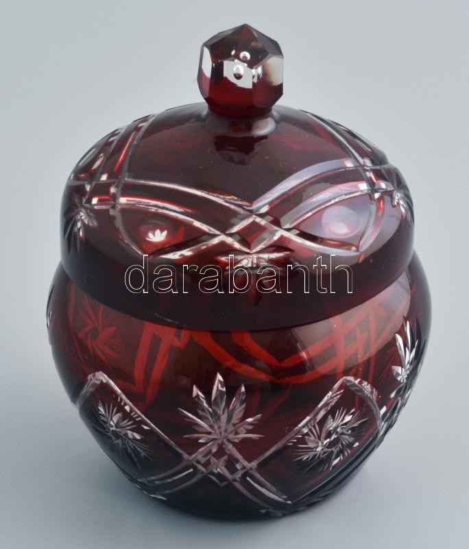 Leírás: Bordó ólomkristály cukortartó fedővel, metszett, néhány kis csorbával, m: 13,5 cm