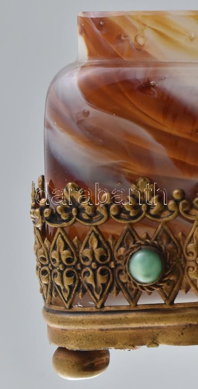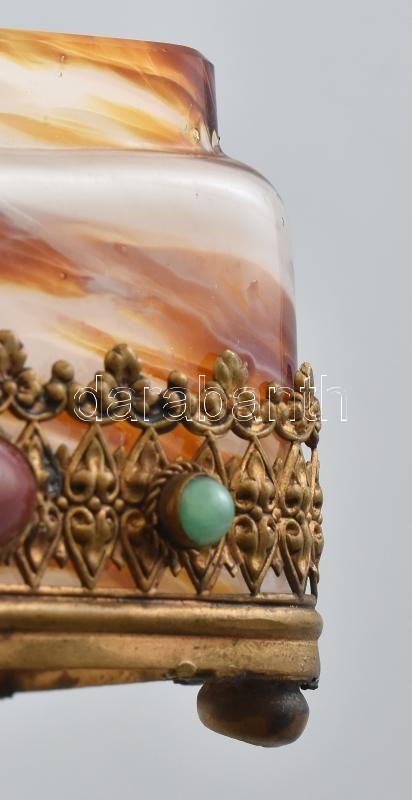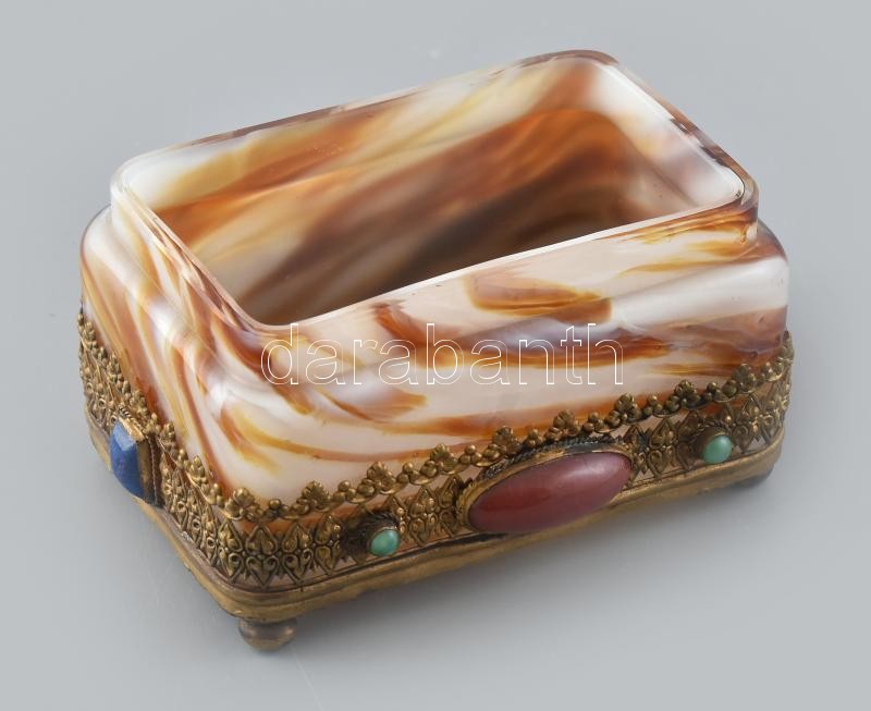 Leírás: Márványüveg kínáló, díszes fém tartóban, kopásnyomokkal, 12x9cm
