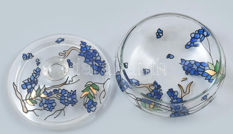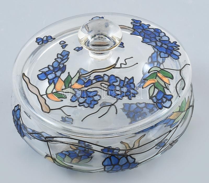 Leírás: Nagy méretű tordai kristály bonbonier, festett, fedelén, az illeszkedésnél apró csorba, funkcióját nem befolyásolja. Jelzés nélkül. D: 17 cm