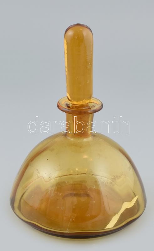 Leírás: Régi Erlenmeyer lombik. Borostyán sárga, üvegdugóval. Csiszolt. 18 cm