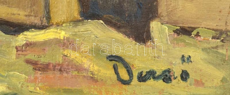 Leírás: Dezső jelzéssel: Falusi utca (Erdély?). Olaj, vászon, javított, sérült (szakadással). Dekoratív fakeretben. 60x80 cm
