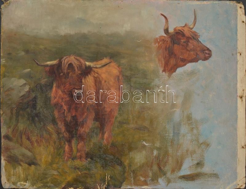 Leírás: Jelzés nélkül, feltehetően XX. sz. eleje: Bivaly tanulmányok. Olaj, vászon, sérült. 30x39 cm
