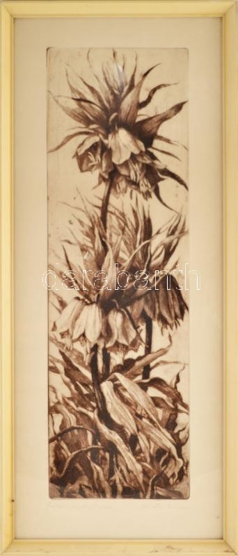 Leírás: Hertay Mária (1932-2018): Császárliliom. Rézkarc, papír, jelzett, számozott (14/100), üvegezett fakeretben, 65×20 cm