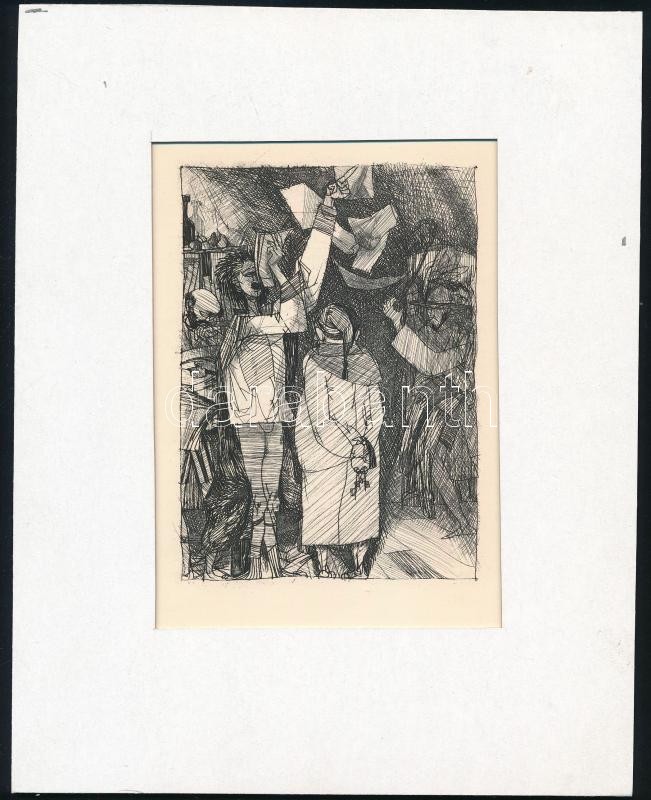 Leírás: Kondor Béla (1931-1972): Megbeszélés. Rézkarc, papír, jelzés nélkül, paszpartuban, 11×8 cm