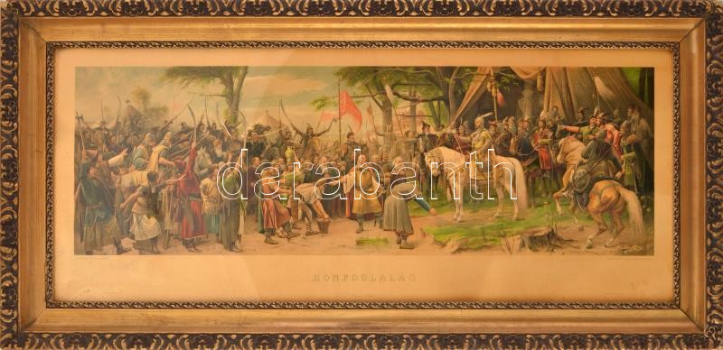 Munkácsy Mihály (1844-1900). Honfoglalás. Színes chromolitográfia, papír. Kiadta Könyves Kálmán Rt., 1905-10 körül. Lap széle kissé foltos. Üvegezett, dekoratív fa keretben. 28x87 cm