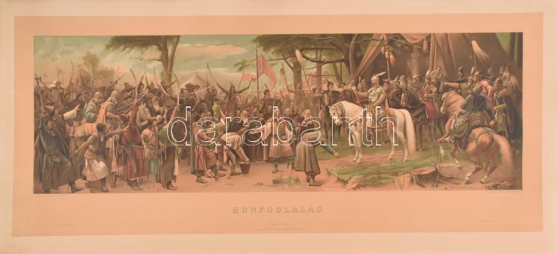 Leírás: Munkácsy Mihály (1844-1900). Honfoglalás. Színes chromolitográfia, papír. Kiadta Könyves Kálmán Rt., 1905-10 körül. Lap széle kissé foltos. 28x87 cm