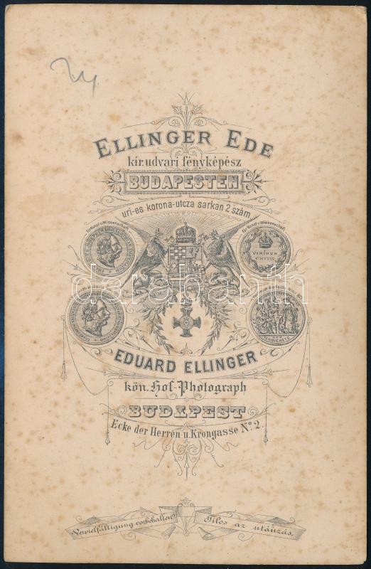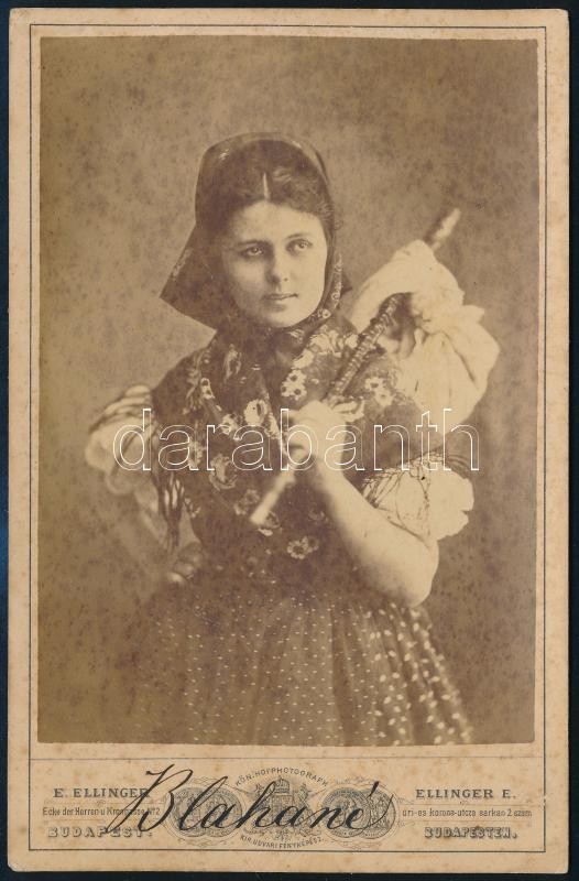 1871 Blaháné (Blaha Lujza, 1850-1926) a Tündérlak Magyarhonban című népszínmű Marcsájaként, a Nemzeti Színház tagjaként eljátszott első - nagysikerű - szerepe, Ellinger Ede műtermében készült portré, kabinetfotó, másik személytől származó névbejegyzéssel, foltos, 17x11 cm