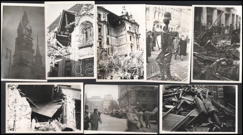 1956 17 db fotó a forradalom idejéből, Budapesti helyszínek, többségében a hátoldalán feliratozott (Reviczky u., József krt.-Krúdy u. sarok, Üllői út, Széna tér, stb.), jelzés nélkül, 12x9 cm