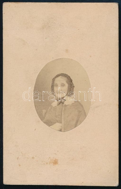 Leírás: cca 1865 Idős hölgy portréja, keményhátú fotó Mager Ármin komáromi műterméből, 10,5×6,5 cm