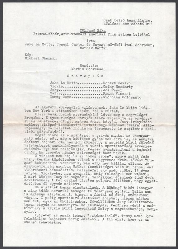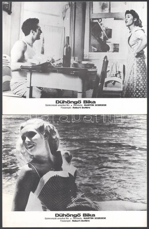 cca 1980 ,,A dühöngő bika" című amerikai film jelenetei és szereplői (köztük Robert DeNiro), 10 db produkciós filmfotó, nyomdatechnikával sokszorosítva, egyoldalas nyomással, kartonlapokon, a használatból eredő (esetleges) kisebb hibákkal, + hozzáadva a film tartalmi kivonatát, amelyet belső használatra készített a MOKÉP, 18x24 cm