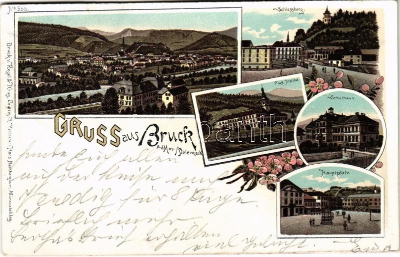 Leírás: 1897 (Vorläufer!) Bruck an der Mur (Steiermark), Schlossberg, Pius-Institut, Schulhaus, Hauptplatz. Druck v. Regel & Krug Art Nouveau, floral, litho