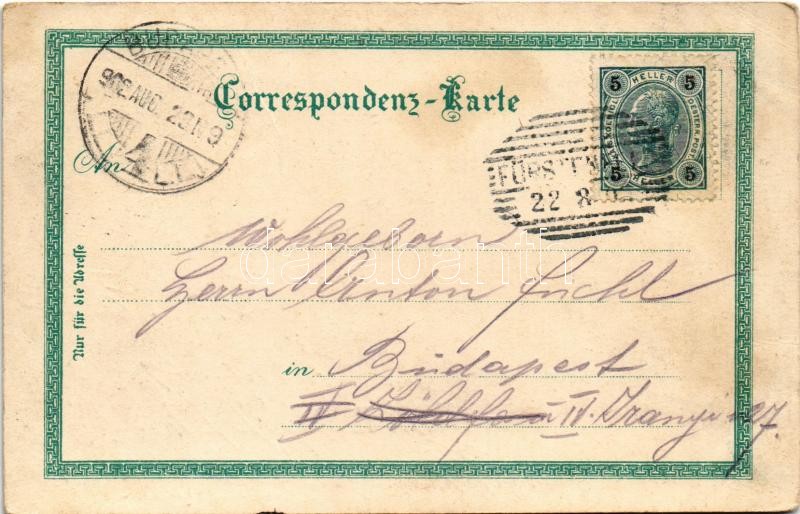 Leírás: 1902 Fürstenfeld, Fölöstöm (Steiermark); K.k. Tabak-Haupt-Fabrik, Städt. Badeanstalt, Grazer Platz, Hotel Brauhaus, Hauptplatz / tobacco factory, bath, hotel, main square. L. V. Enders'sche Kunstanstalt. Verlag Julius Buchner. Art Nouveau, floral, litho (EK)