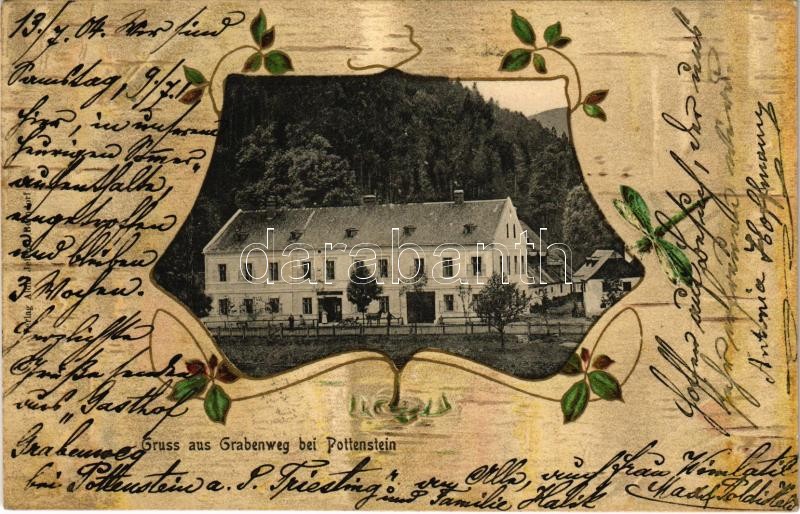 Leírás: 1904 Grabenweg bei Pottenstein, Gruss aus... / street view with inn, shop. Verlag Alois Jelenz. Art Nouveau, floral, litho (EK)