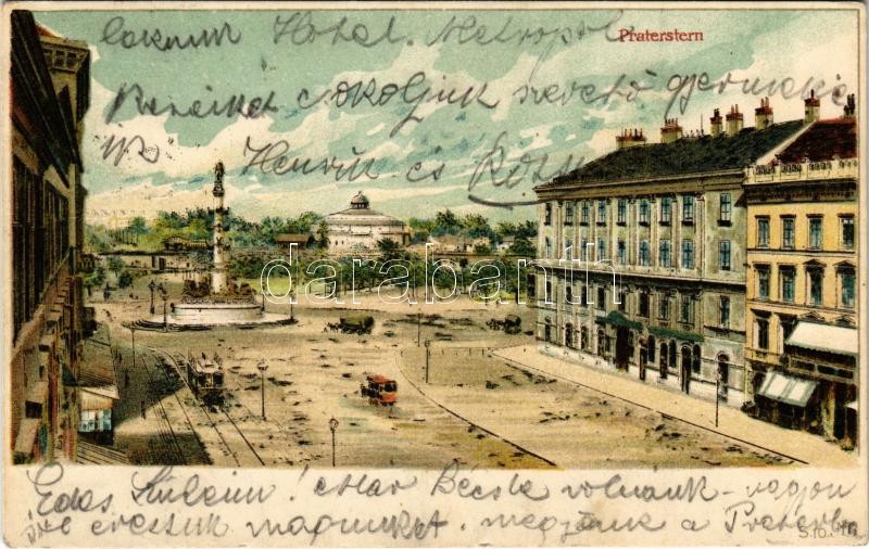 Leírás: Wien, Vienna, Bécs; Praterstern mit Tegetthoff-Monument / street view, monument, horse-drawn tram. litho